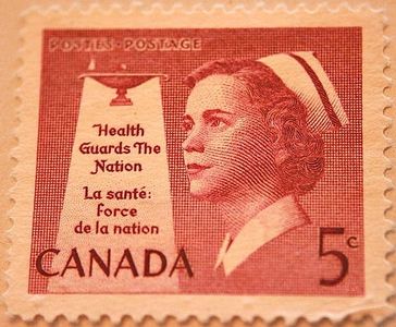 This commemorative postage stamp stresses the importance of health to the individual Canadian as well as the entire nation. Both the nurse wearing her cap and the lamp (symbolic of the noble profession of nursing) emphasize the ideals of national health. Public health has made great advances in Canada in recent years. Through health programs, education has pointed the way to sounder bodies, improved living conditions, and better health. In conjunction with provincial health- promoting activities, Canada's National Health Program has been moving forward to new objectives. The portrait of a nurse forms the central motif of this stamp. Lettering in the vertical light from a nurse's lamp suggests the theme of the issue: "Health Guards the Nation" and in French, "La santé: force de la nation." This was the first Canadian postage stamp purposely designed with a living model as the featured symbol of the theme the stamps express. Cited from Stampsandcanada.com Cited from Stampsandcanada.com